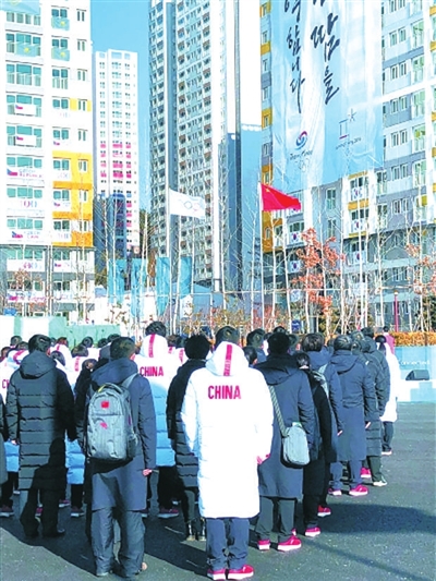 7日上午的江陵奥运村晴空万里,身着白色服饰的平昌冬奥会中国体育代表团成员在广场列队,注目五星红旗冉冉升起,他们眼神中充满敬意,心中满是对数日后赛场上国旗飘扬的期待。