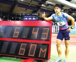 本报综合消息 北京时间昨日凌晨,2018年国际田联世界室内巡回赛杜塞尔多夫站男子60米比赛中,中国选手苏炳添继续展现出极佳的竞技状态,跑出6秒43的成绩再次夺冠,这是他2018年至今连续拿到的第三个室内60米冠军,并打破几天前刚刚在卡尔斯鲁厄创造的6秒47的亚洲纪录,他也由此成为历史上室内男子60米跑的第五快的选手。