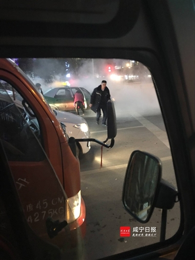 11日傍晚6时10分许, 中交资管湖北区域管理总部机关司机葛宏斌驾驶公司车辆,行至银泉大道路与咸宁大道交叉口等红灯。此时,他突然看见,同在此路口最左边车道一辆出租车右前轮起火了。
