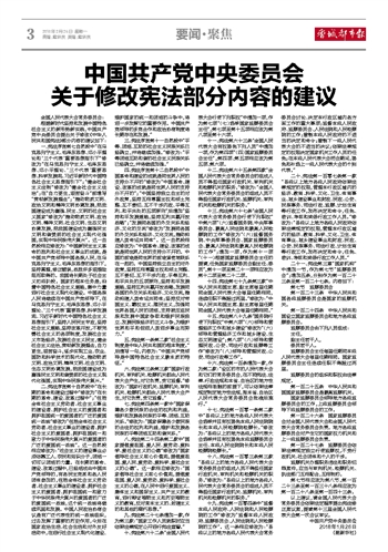 中国共产党中央委员会关于修改宪法部分内容的建议