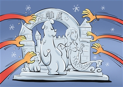 长沙天心区芙蓉南路的一处冰雕馆,春节假期游客络绎不绝。但假期热潮过后,这里的很多冰雕作品却遭了殃。熊没了眼睛,美人鱼的胳膊严重变形,随时有断裂的风险。有人甚至在冰雕上凿洞或掰掉一部分带走。