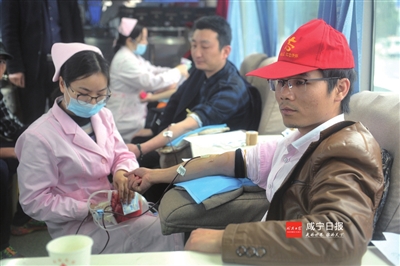来自国家电网咸宁供电公司共产党员服务队的志愿者邱洋、方华和陈斯3人也参与了当天的献血活动。据悉,邱洋当天献血400毫升,这是他第二次无偿献血。