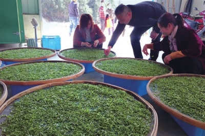 “茶山上所种植的是从浙江引进的特早茶品种‘乌牛早’,它在惊蛰时节便可萌芽,春分之前便可上市,采摘期明显早于其它名茶,3月3号就已经进行了首批开采,今天是第三批。” 丫吉茶业公司总经理毛建华说。