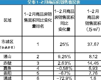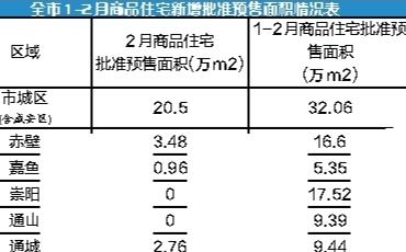 1-2月,我市城区(含咸安区)商品住宅批准预售面积32.06万m2,同比上升40.3%。1-2月全市商品住宅批准预售面积90.36万m2,同比上升41.1%。