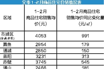 1-2月,我市城区(含咸安区)商品房销售总金额11.56亿元,其中商品住宅销售总金额10.36亿元,商品住宅均价4053元/㎡,比去年同期高出991元/㎡。1-2月,全市商品房销售总金额21.85亿元,商品住宅均价3217元/m2,比去年同期高出372元/m2。