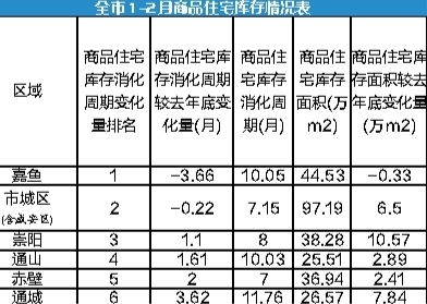 截至2月,全市商品住宅库存面积269.02万平方米,库存较去年底上升29.88万㎡,消化周期8.38个月,较去年底上升0.52个月。市城区(含咸安区)商品住宅库存面积97.19万平方米,库存较去年底上升6.5万㎡,消化周期7.15个月,较去年底减少0.22个月。