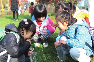 孩子们一边走一边与同伴谈论着自己的发现。在老师的细心讲解中,他们对春季各类花卉树木有了更直接的认识,不少小朋友在老师的指引下,拾起散落在地上的垃圾走到垃圾桶前,把垃圾扔了进去。