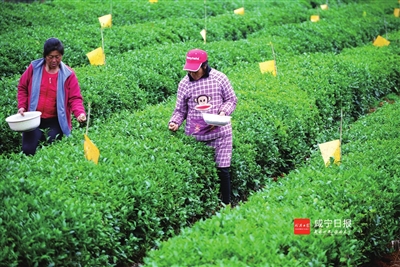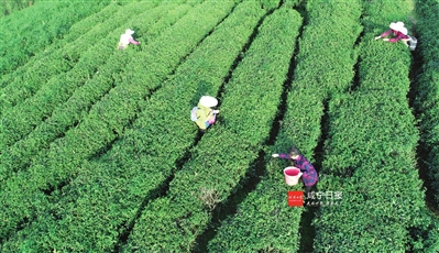 随着气温逐步回升,我市春茶陆续进入采摘期,茶农抓紧晴好天气,抢采新茶、供应市场。图为咸安区马桥镇黑山茶场茶农正在采茶。 赵忠志 张仰强/摄