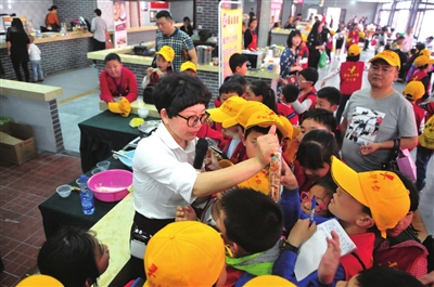 本次活动主题为美食节,小记者们当然不能错过美食。现场有几十家特色餐饮企业参展。为了让小记者们对咸宁的传统美食多一些了解,通山的包坨姐——通山九宫乡人特色食品有限公司的万咏,给小记者们现场讲解了包坨的传说和做法。
