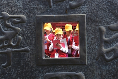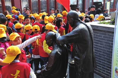 沿着大门楼走进古街,映入眼帘的铜钱铜雕,古铜色的留着历史的痕迹,大小不一的银元上刻有不同的汉字,在讲解员的引导下,小记者们学认读铜钱。“按照上下右左的顺序,我学会了认铜钱。” 小记者付康瑞把所有的铜钱铜雕认了个遍。在被誉为魁星楼的大戏台前,小记者们学到了“独占鳌头”、“金榜题名”、“任你文章高八斗,就怕朱笔不点头”等成语、名句。在钱六姐铜像前,小记者们知道了在马桥还有一个精通诗词歌赋的奇女子。“她一边看书,一边做家务,真了不起。”小记者沈墨雅首先是被钱六姐铜像前的磨盘铜雕所吸引,了解了钱六姐的成长故事之后,她更加钦佩钱六姐潜心苦读的精神。