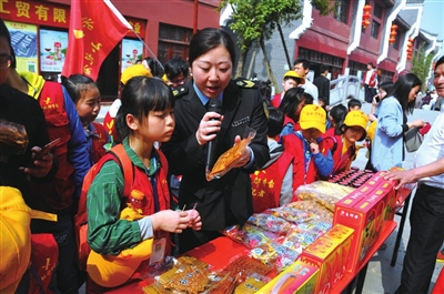 “大家知道我们该如何辨别买的零食是否安全吗?”参观了香城古街,了解了古街的建筑文化后,市食药监局的工作人员给小记者们上了一堂食品安全课。听说要教大家如何购买放心零食,小记者们一瞬间就将讲课老师团团围住。休息台成了教室,小记者们纷纷掏出随身的零食给老师“鉴别”。