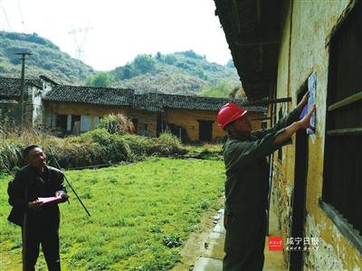 4月2日,国网湖北咸宁通山县供电公司员工在山火、外破多发区的线路、村庄、路口设立醒目的防山火、防外破警示标志,粘贴宣传标语。
