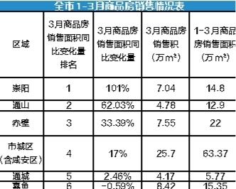 1—3月份,城区(含咸安区)商品房销售面积63.37万㎡,同比上升20%(其中新建商品房销售面积44.38万㎡,商品住宅销售面积39.46万㎡,商业用房销售面积4.92万㎡),二手房销售面积18.99万㎡。