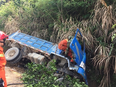 消防官兵在救援现场发现,这辆小型卡车由于强烈的冲击导致驾驶室严重变形,司机双腿被卡住无法动弹。