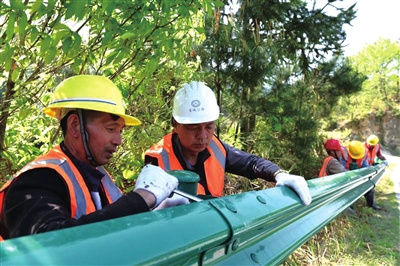 近日,在通城县马港镇潭高线易段路,施工队员在安装波形梁护栏。