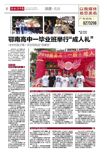 高考临近,为了缓解应考学子的压力,鄂南高中高三(一)班的学生在家长和老师的策划下,成功举办一场“成人礼”活动。学生们统一服装,过成人门,集体宣誓……一场课外活动如火如荼地展开,家长、学生、老师都收获满满。