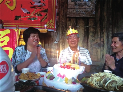 本报讯(记者吴青朋 通讯员刘旺云)5月24日,崇阳县金塘镇林家村一片欢声笑语,村民们为一位90岁的台湾同胞举办生日宴会,大家一起开开心心看提琴戏,品尝生日蛋糕。