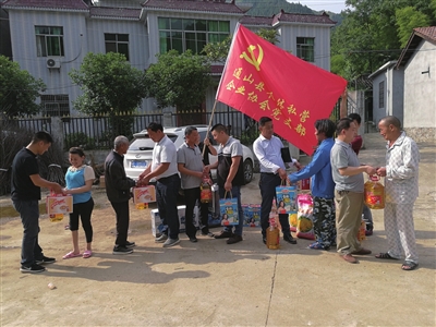6月1日,通山县个体私营企业协会党支部组织10名个体工商户,为该县黄沙铺镇柏树村贫困户送去了食用油、大米、饮料、电扇和慰问金。