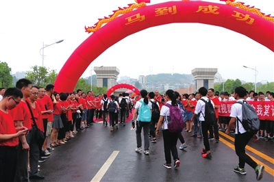 伴着庄严的国歌和富有青春旋律的校歌,送考仪式拉开帷幕。家长代表给学校赠送纪念品,并为考生送上美好的祝福。学校老师代表的发言有考前的叮咛,也有殷切的期盼,充满激情的祝福激起全场阵阵掌声。校长李育军的发言意味深长,他叮嘱毕业班学生要珍惜青春,满怀激情地拥抱生活、执着追求自己的目标、勇敢地接受检阅和挑战。毕业班学生宣誓之后,初二学生在“成功门”两侧夹道欢送,为毕业班学子呐喊助威,统一身着红色送考服的老师们为考生鼓劲壮行,把现场气氛推向了高潮。