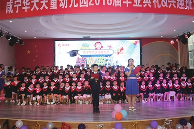 “当我第一次走进幼儿园, 这里的小朋友真友好, 这里的老师真亲切。 我在幼儿园学到了好多本领, 我们学会了说英语, 我们爱上了绘本阅读,我们画的画越来越有趣,我们的舞蹈跳得越来越美。 亲爱的老师, 您爱我们, 教育我们, 照顾我们, 您知道吗? 我们真想叫您一声——妈妈! ……再见了,我亲爱的老师、伙伴们,再见了,我的幼儿园!“ 6月22日,咸宁华大天童幼儿园大班组开展了毕业典礼活动。家长和孩子们一起盛装出席,只为纪念这一令人难忘的时刻。