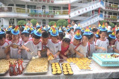 大操场上,长桌排开,美食摆上台,餐桌上随风飘动的可爱气球让整个现场变成了一个盛大的Party。