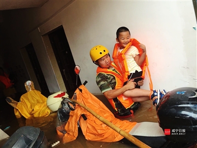 半小时后,嘉鱼县北门湖内涝,10多名群众被困。正在救援的消防官兵又赶往现场,队长丁阳带领着消防官兵,徒步涉水,挨家挨户搜索被困居民,营救疏 散人员12人。