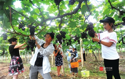 进入夏季,水果采摘也迎来了旺季。昨日,湖北坤元第五季现代农业开发公司的采摘基地里,游客如织。大家一边采摘可口的葡萄,一边体验农家乐。 (记者 庞赟 赵忠志 见习记者 周园媛)