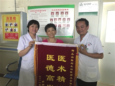 考虑到老伴目前卧病在床,生活不能自理,余婆婆对陈刚提出带着老伴一齐住院,进行治疗的设想,得到了陈刚的同意。4月28日,经过近3个小时的手术,陈刚为余婆婆摘除了肾上腺肿瘤。在余婆婆康复期间,细心的陈刚还多次去病房看望余婆婆和她的老伴,多次耐心讲解治疗方案,鼓励余婆婆和其丈夫树立战胜病魔的信心,科室的护士们也无微不至的护理着余婆婆和她的丈夫。感动之余,出院后的余婆婆专程托人定制了一面锦旗送到医院。