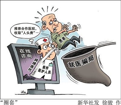 湖南一家民营医院的负责人告诉记者,现在有不少公司专门从事网络问诊工作,表面上是为患者“答疑解惑”,实际上是招聘了一批没有任何专业医疗知识的医托来“拉客”,诱骗患者到关联医院看病。“有些公司专门为医院和患者牵线搭桥,然后向医院收取人头费,实际上就是在卖患者。”这位负责人说。