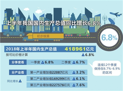 初步核算,上半年国内生产总值418961亿元,按可比价格计算,同比增长6.8%。分季度看,一季度同比增长6.8%,二季度增长6.7%,连续12个季度保持在6.7%至6.9%的中高速区间。