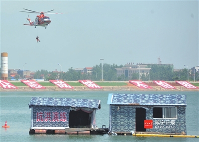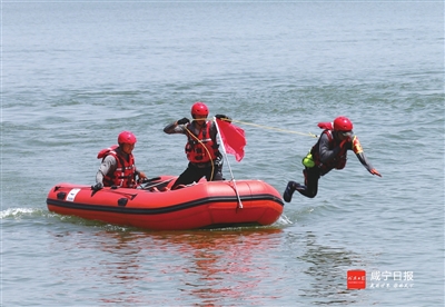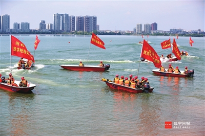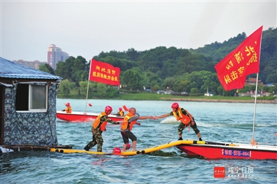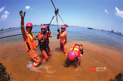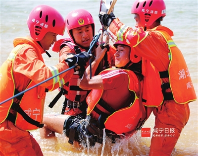 昨日,省消防总队在嘉鱼县三湖连江水域举行弘扬98抗洪精神暨跨区域应急救援实战拉动演练。
