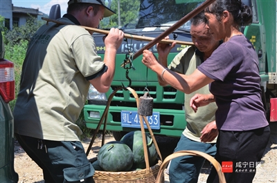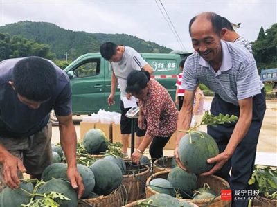 7月19日,崇阳县桂花泉镇官庄村的西瓜地里一片忙碌,该县邮政分公司的员工正在帮忙摘西瓜、挑西瓜、称西瓜、装上车。今年这里的黄瓤西瓜供不应求,107户贫困户种植的黄瓤西瓜销售一空,瓜农们笑逐颜开,心里乐开了花。