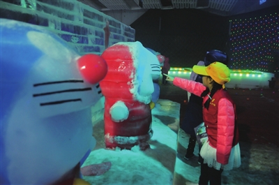 注入卡通形象的冰雕,让小记者们迅速找到共同的话题,神情各异的哆啦A梦、憨态可掬地熊大熊二等动画主题冰雕,一一呈现在面前。