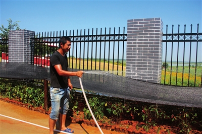 7月19日,咸安区向阳湖湿地花海景区侧门,苗木工人正在为绿化苗木浇水。连日来,我市气温持续攀升,景区组织苗木工人给苗木铺设遮阴网,并定时为绿化苗木浇水,为其“解渴”降温。(记者 王奇峰 实习生 鲁颖 通讯员 李星 刘庆云)