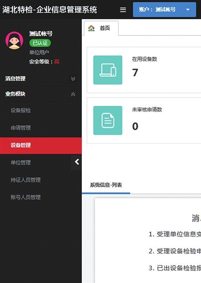 通过微信关注“湖北特检”公众号,点击公众号下方的“服务大厅”进行访问,如图: