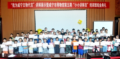 在市博物馆二楼多功能厅,60名小学员依次登上结业典礼舞台,进行“我为咸宁文物代言”讲解展示,其中20名小小讲解员入围“优秀小小讲解员”。老师和家长齐聚一堂,共同见证、分享了小小讲解员们成长的喜悦和毕业的欢乐。