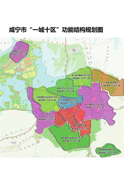 10、武咸协同发展区:位于咸宁与江夏交界处,依托贺胜桥镇余花片区发展,规划用地面积约67平方公里,是武汉产业转移预留发展空间,城市战略发展留白区域。