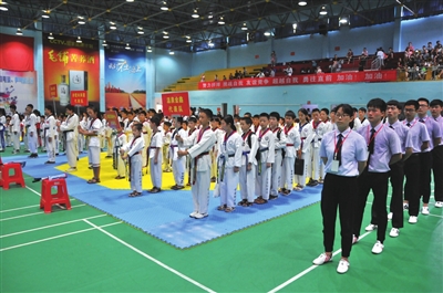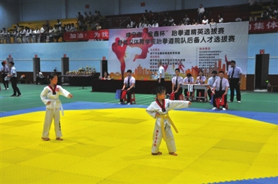 赛场上,运动小将们身着道服,佩戴护具,个个精神抖擞。品势比赛中,选手们的一招一式、一拳一脚,动作一律整齐,姿势一一到位,有章有法。竞技比赛里,选手之间的过招,则凌厉干脆,攻守俱佳。虽然选手们大都是青少年,但他们用自身实力证明自己,展示出“礼义廉耻,忍耐克己,百折不屈”的跆拳道精神。
