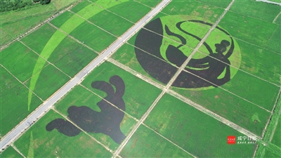 日前,记者在咸安区高桥镇白水畈田野通过无人机航拍看到,一幅“仙萝花洲 嫦娥奔月”的巨型稻田画呈现在乡村田园中,美轮美奂。