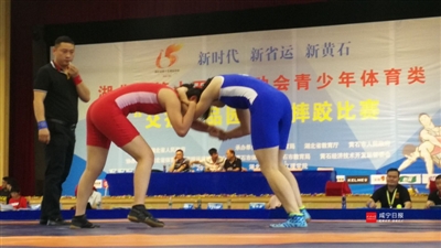 8月9日,在省运会青少年摔跤比赛中,咸宁代表队运动员钟艳芬(右图,着蓝色运动服)夺得女子甲组56公斤级亚军,为咸宁代表团再添一枚奖牌。