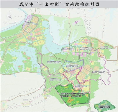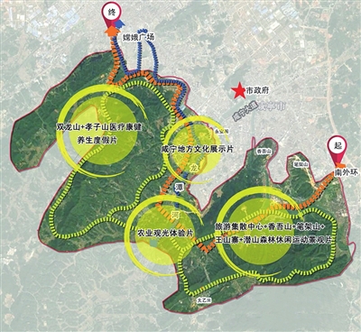 四片:1、旅游集散中心+香吾山+笔架山+王山寨+潜山森林休闲运动景观片;2、农业观光体验片;3、咸宁地方文化展示片;4、双龙山+孝子山医疗康健养生度假片