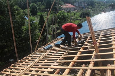 近日,在崇阳县白霓镇浪口村,工人们正在给村民的房子盖瓦。