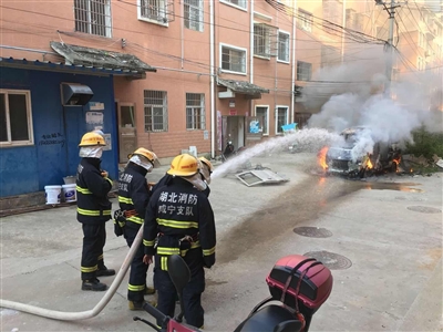 当日上午8时许,咸安区浮山中小学附近一车辆起火,咸安消防迅速出动10名消防官兵赶赴现场处置。
