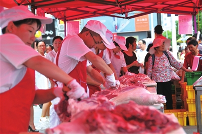 在白条猪肉部位解剖及商品包装技能项目,抡一把大刀,唰唰两下,没几分钟时间,半扇猪就分割 成排骨、精瘦肉、白条……庖丁解“猪”,巾帼不让须眉,过往的市民看得是一愣一愣的;