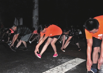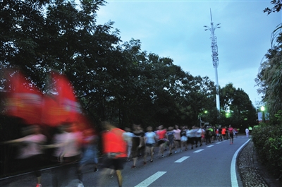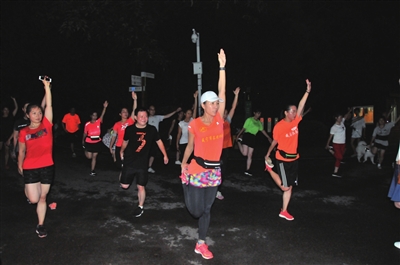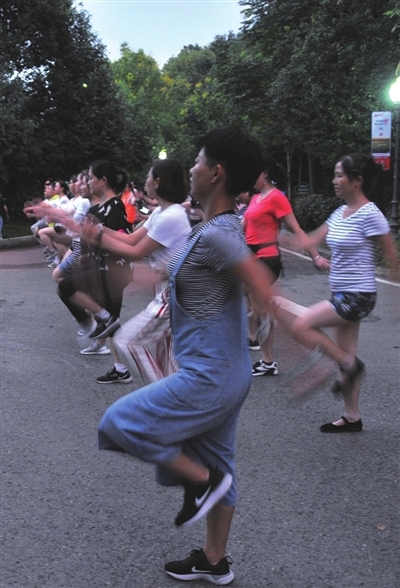 8月29日傍晚6时50分许,太阳西斜,公园内仍然酷热难耐。本该在家中享受空调惬意的时刻,十六潭公园内却聚集了越来越多的市民,不一会便聚集了百余人。男女老少穿戴着运动鞋、运动衣,个个伸腿拉腰,跃跃欲试。