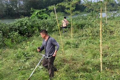 近日,崇阳县青山镇铺前村隽水河滩涂地雷竹基地内,当地农户正在用机械打草。
