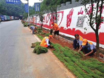 换填黄土、栽植草皮、铺设沥青……连日来,通山县公路局组织党员对S209省道咸通线通山境内的路况、路容路貌进行全面整治,绿化路肩、疏通水沟、完善钢护栏和路面标线,安装公路文化牌和红色主题宣传牌。图为养护工人正在路肩栽植草皮。