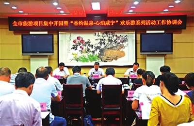 本报讯 (记者 叶子 庞赟 通讯员孔祥轶 柴倩) 9月1日,全市旅游项目集中开园仪式暨“相约温泉·心泊咸宁”欢乐游系列活动工作协调会在市会议中心召开,会议主要安排部署2018年旅游节相关工作,策划推动“相约温泉·心泊咸宁”欢乐游系列活动,筹备一批旅游项目集中开园以及部署旅游品质提升和旅游安全生产等工作。