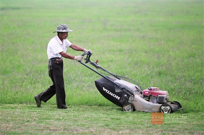 9月15日,位于咸安区官埠桥镇的草皮基地,工人们在正忙绿着修剪草坪。
