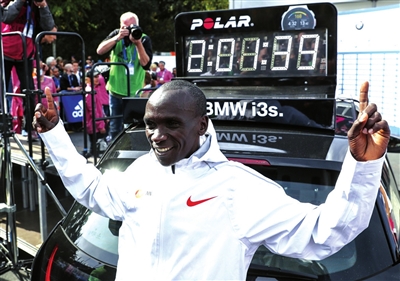 本报综合消息 北京时间16日,在世界大满贯柏林马拉松比赛后,传出令人类振奋的好成绩!在第45届柏林马拉松上,33岁肯尼亚名将基普乔格以2小时1分39秒夺冠,打破了肯尼亚的丹尼斯·基梅托保持的马拉松纪录,后者在2014年柏林马拉松赛上夺冠时创造了2小时2分57的世界纪录。